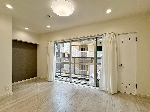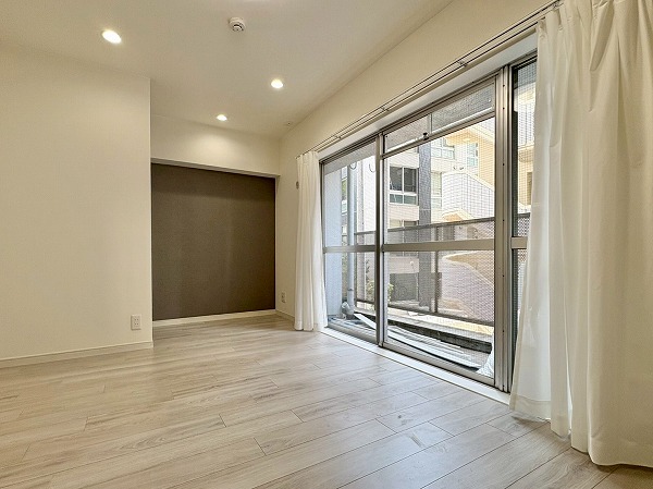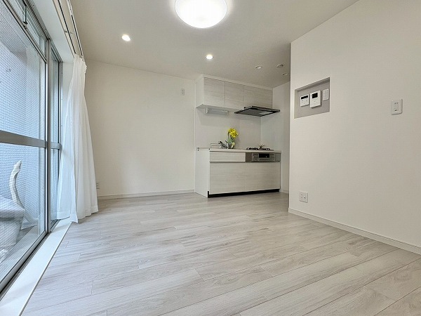 南東向きの窓から光が降り注ぐ約9.5帖のリビングダイニングキッチン。淡い日差しがフロアを柔らかく照らし、自然と深呼吸したくなるような明るさに包まれています。壁一面に施されたアクセントウォールが空間の印象を引き締め、シンプルながらも上質な雰囲気を演出。