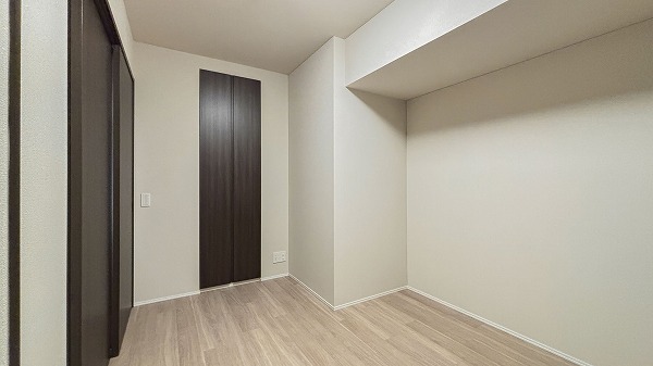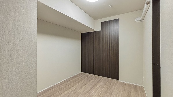 約6.8帖の洋室はベッドを置いてもゆったりとした広さ。南東向きの窓から差し込む朝の光が心地よく、爽やかな目覚めを迎えられます。クローゼットも備わっているので、衣類や荷物をすっきり整理でき、お荷物の多い方でも安心です。