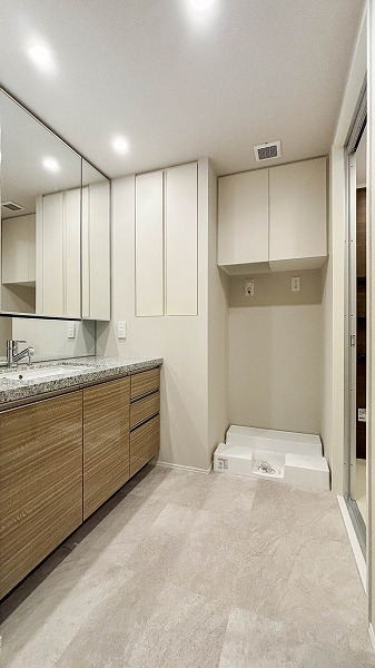 水回りが一箇所にまとまったサニタリールームは、洗面化粧台・ランドリースペース・バスルームが揃い、隣にはトイレもあるので家事や掃除が効率的です。大きな洗面化粧台は収納力抜群で、日用品やヘアケア用品などを整理でき、いつも清潔感を保てますよ♪