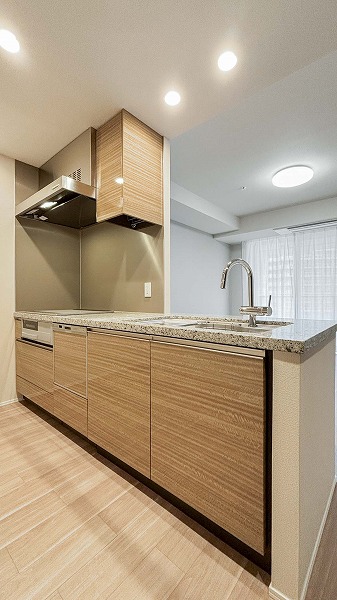 広さ約3.3帖のキッチンは3口のIHコンロやグリル、食洗器、ディスポーザーなど、日々の料理を楽しめる設備が充実!背面スペースも十分にあるため冷蔵庫や収納棚を置いても動きやすく、料理や家事がスムーズに行える空間です。