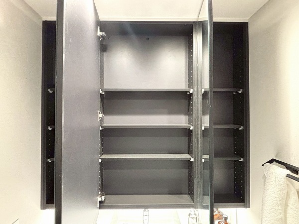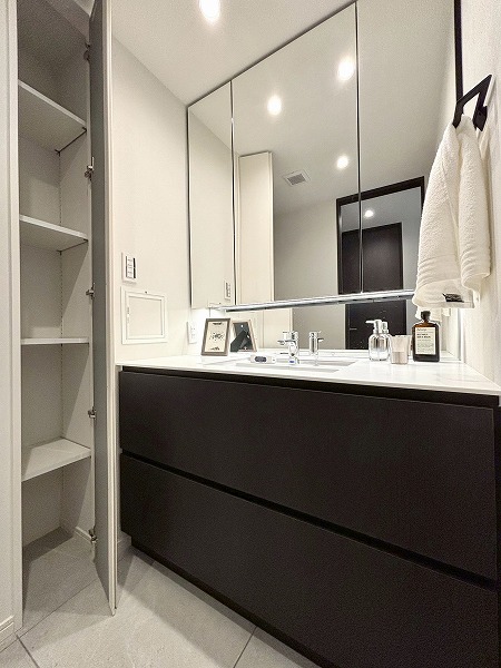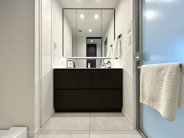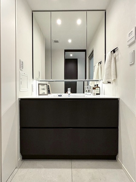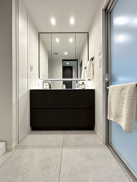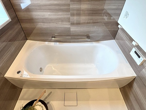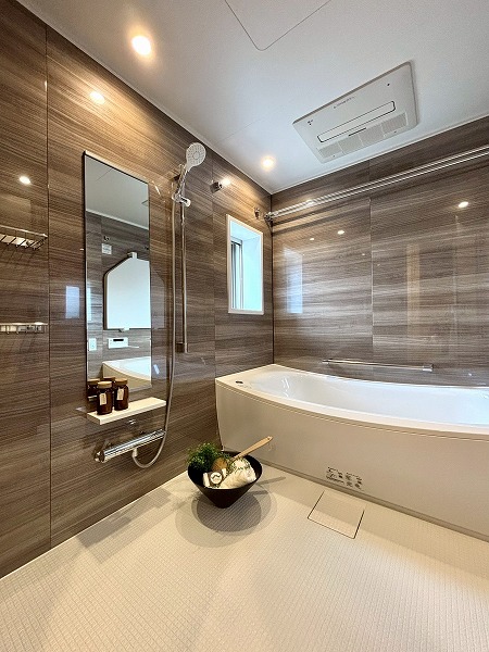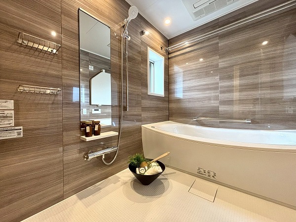 木目調の鏡面パネルが柔らかな表情を演出するバスルームは、広々とした造りで家族一緒の入浴もゆったり✦浴室乾燥機を備えているため、湿気やカビを抑えていつでも清潔な状態をキープできるのも嬉しいポイント。リラックスした時間を心置きなくお過ごしいただけます!