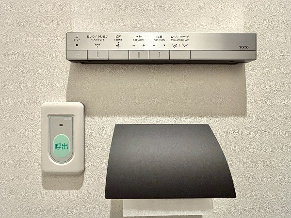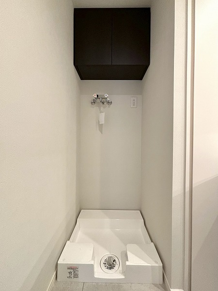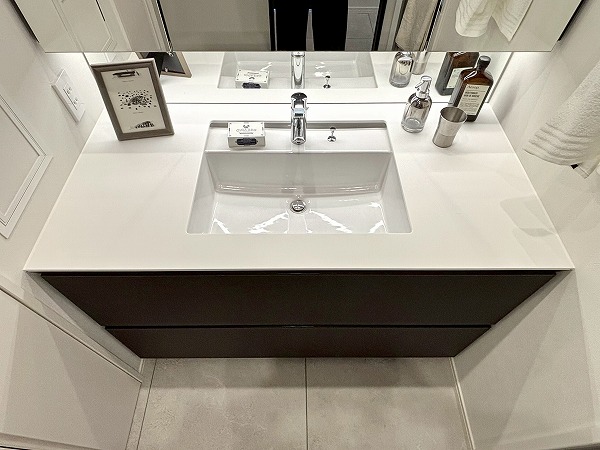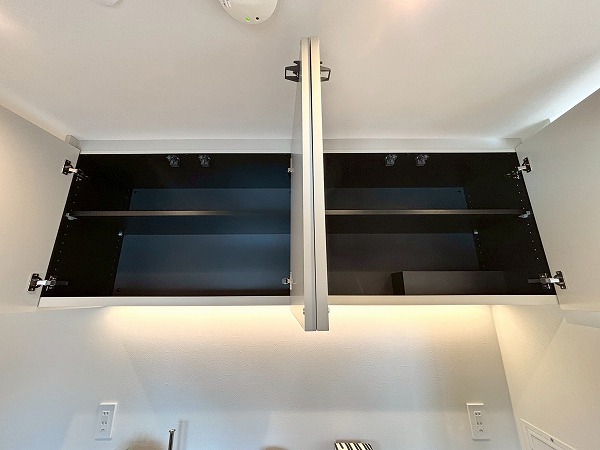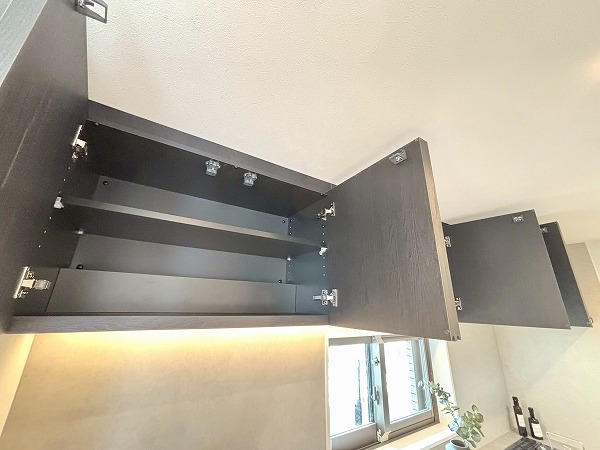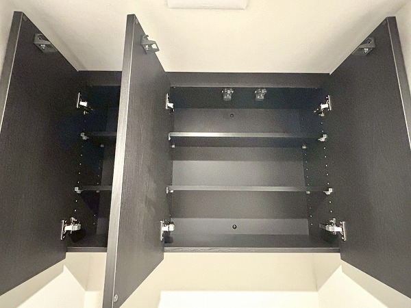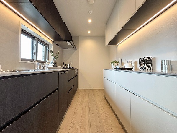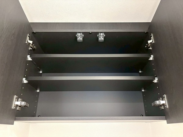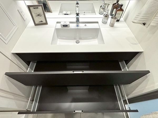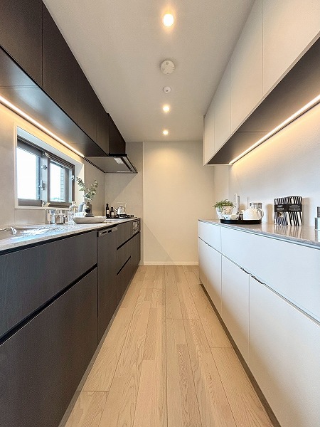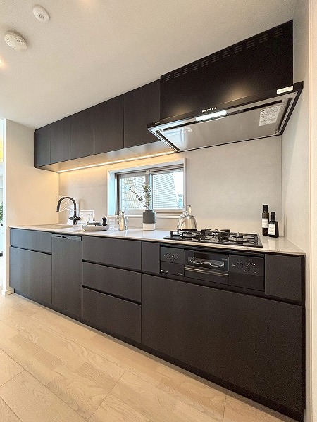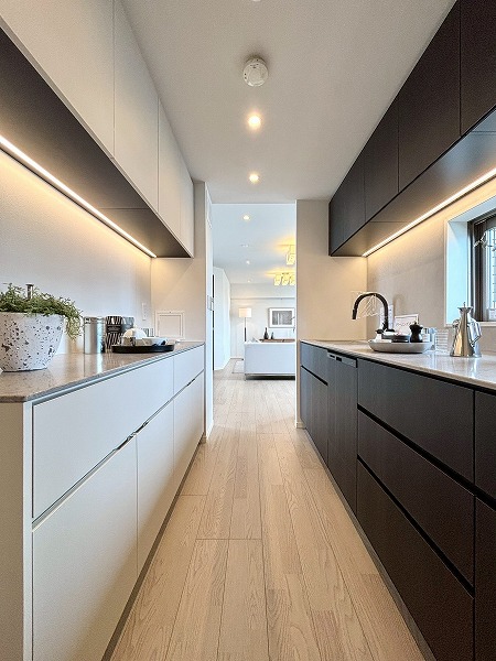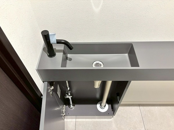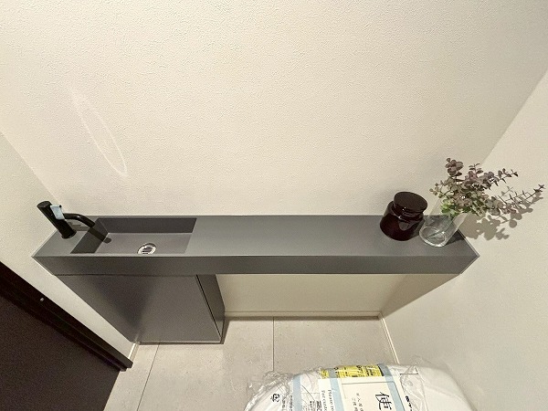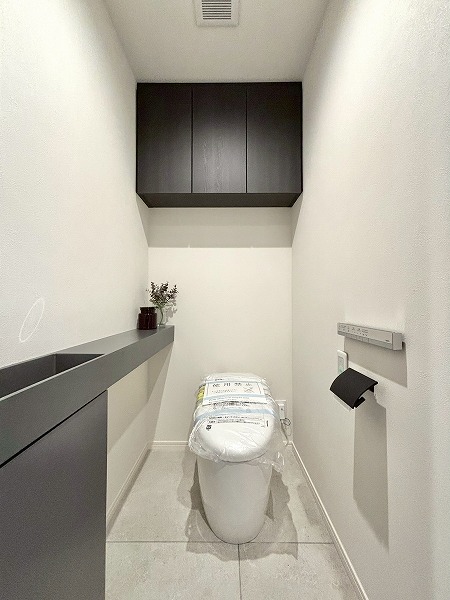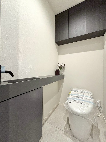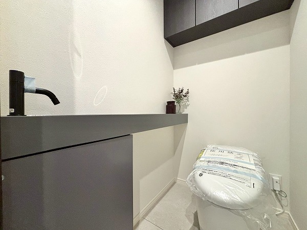 トイレはモノトーンを基調とした落ち着きのあるデザインで、上品な雰囲気を演出。独立した空間に手洗いカウンターを備えており、清潔感を保ちながら来客時にも安心して利用できます。備品は吊戸棚やカウンター下の収納にすっきり収まり、空間を整然と保てる工夫も魅力◎