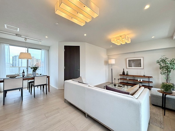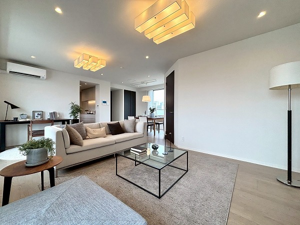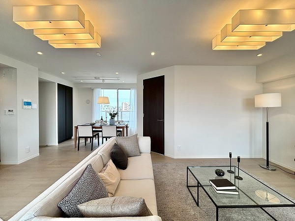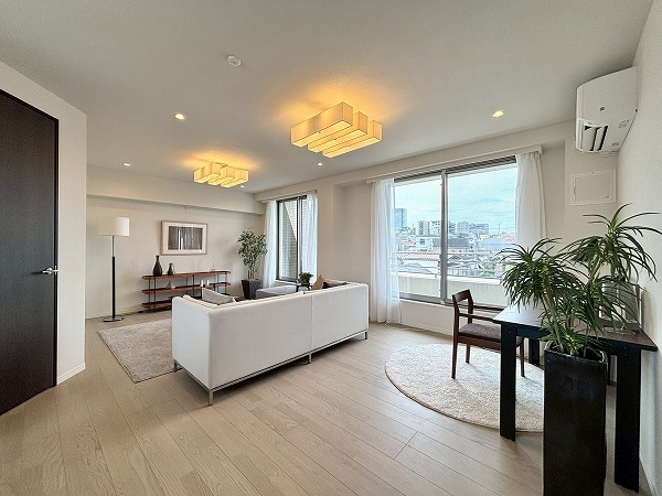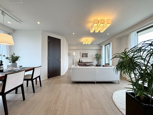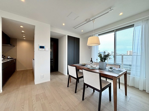 最上階の特権を感じられる南向きリビングダイニングキッチン。約23.2帖の広さがあり、ホワイトを基調にした内装は柔らかな光を受けて明るく洗練された印象に。窓の外に広がる空と街の景色を眺めながら、ゆったりとした時間を過ごせる、日々の生活が少し贅沢に感じられる空間です✦