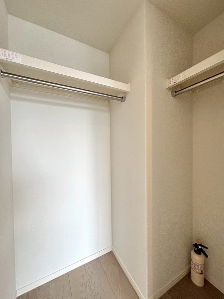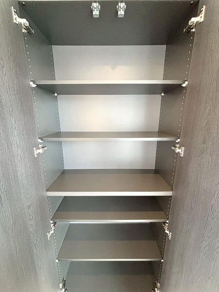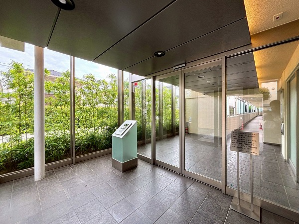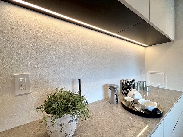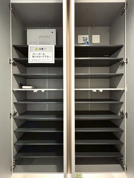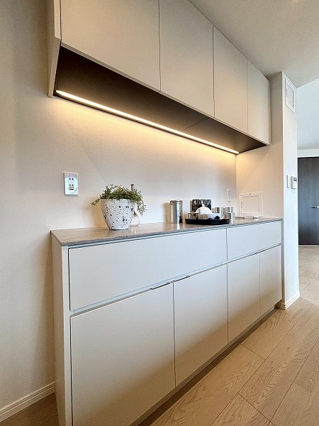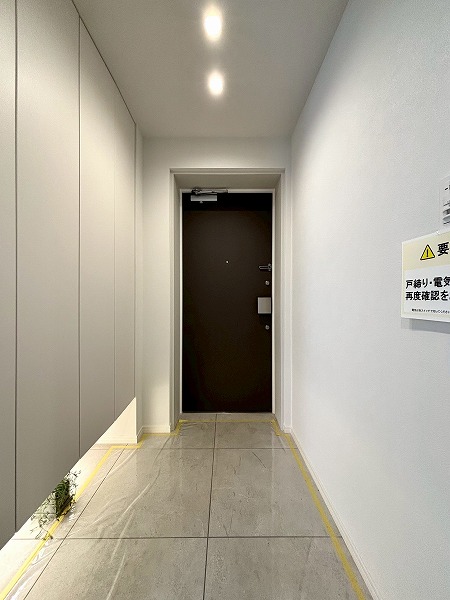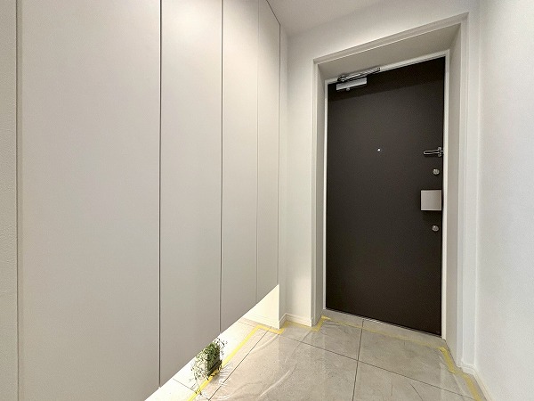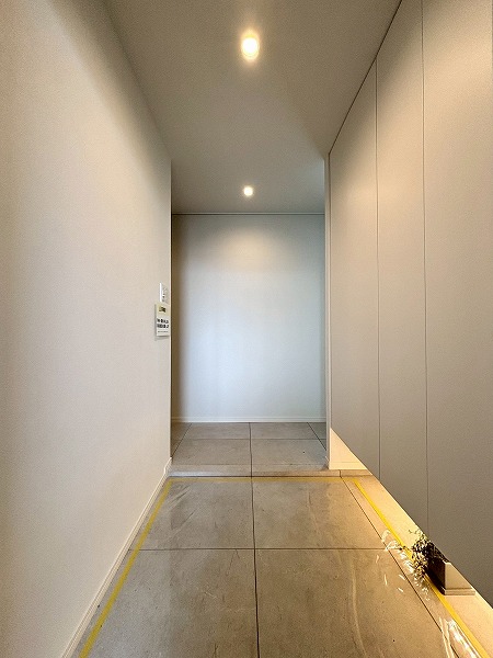 トールサイズのシューズボックスが設置された玄関は、収納力が高くすっきりと整理された印象。足元に灯るやわらかな間接照明が温かみを添え、ゲストを上品に迎え入れます。共用廊下部分にはトランクルームのご用意もありましたよ✦