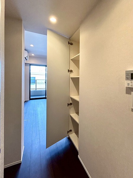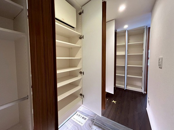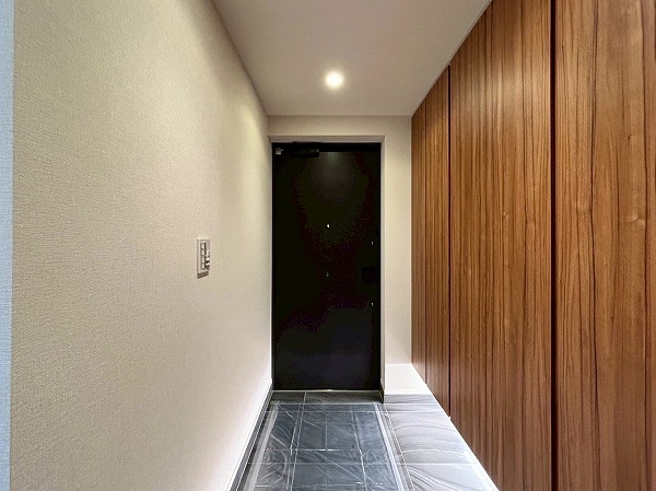 玄関に入ると人感センサーが反応し自動で照明が点灯するため、暗い時間のご帰宅でも安心♡シューズボックスは大容量でお持ちの靴をきちんとしまうことができ、スッキリした印象を保つことができそう✦