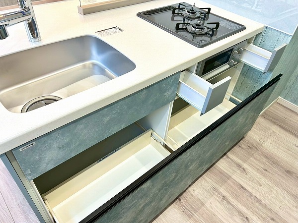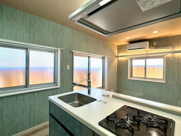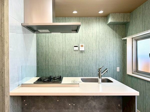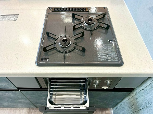 人気のペニンシュラキッチンは、友人や家族と会話をしながらお料理ができますよ♪2口コンロで同時調理も可能です!コンロ前には油避けも設置されており、お掃除楽々。