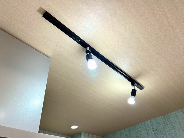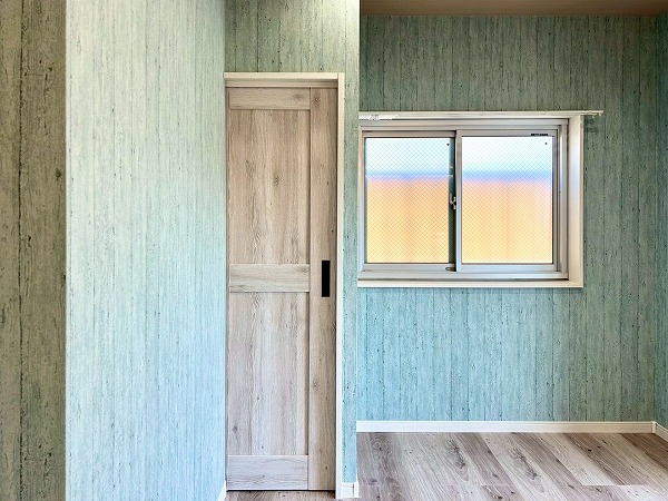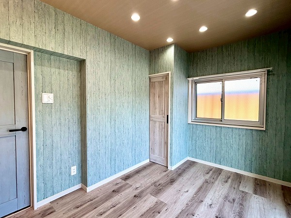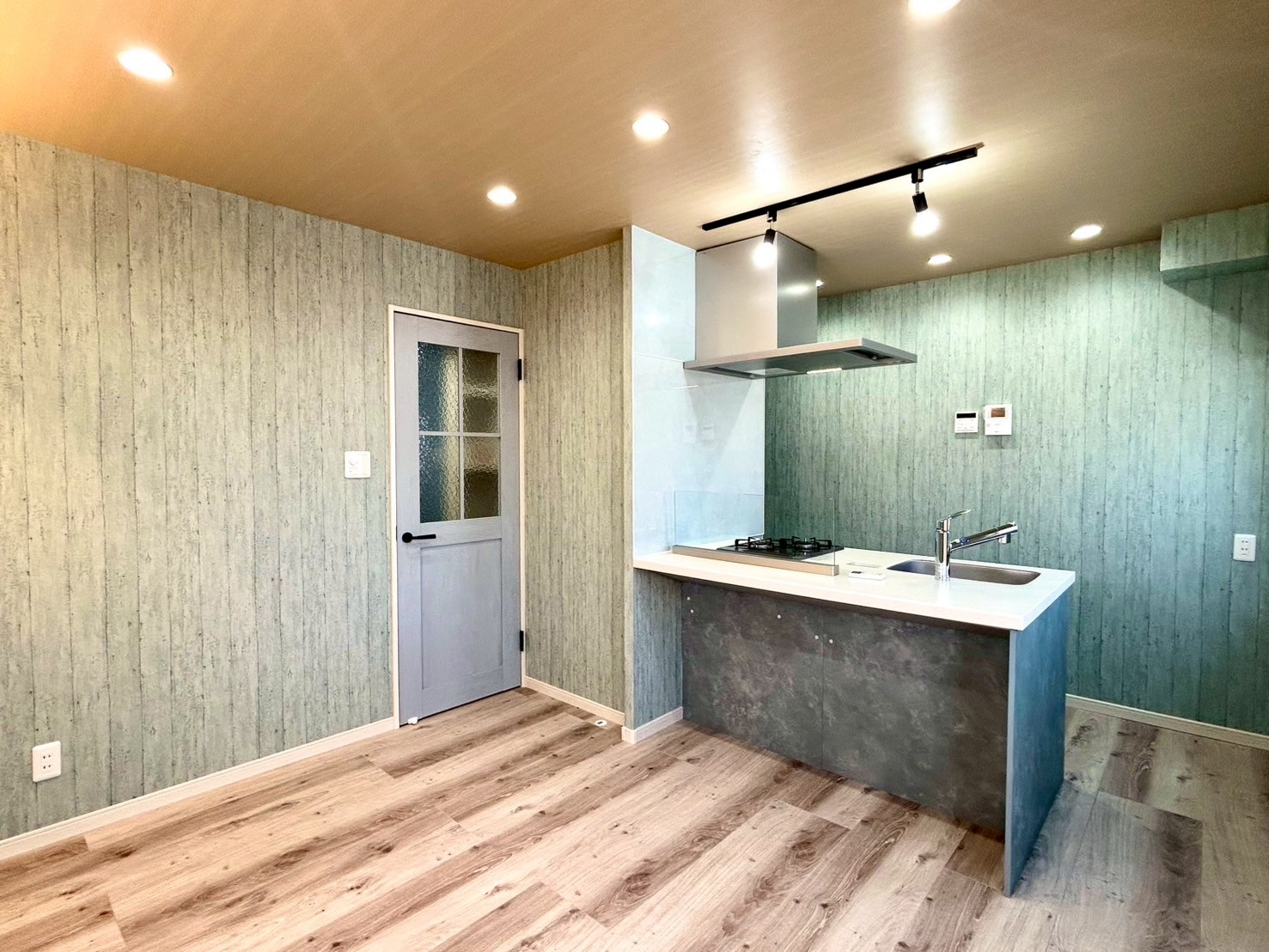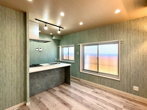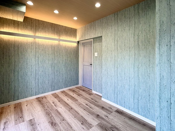約9.8帖のLDKには窓が3つ設置されており、明るく開放感があります✧くすみブルーのクロスと木目調のフローリングは落ち着きがあり、オシャレですね♪壁にはコーニス照明が付いており、空間を柔らかく照らしてくれています。