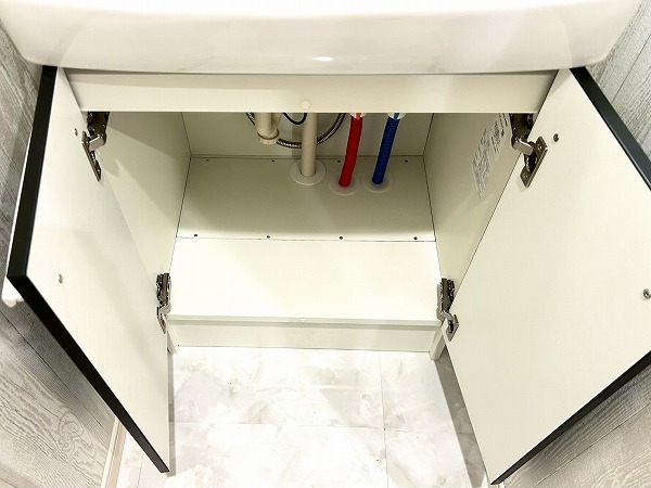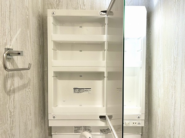 人気の3面鏡が付いた独立洗面台。収納力にも優れ、歯ブラシ等を鏡裏にしまうことができるので生活感を感じにくく、スッキリと整頓できますよ。白を基調としたクロスは清潔感がありますね✧