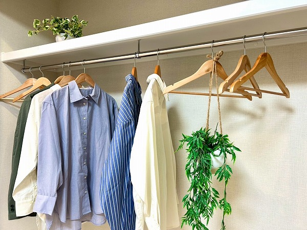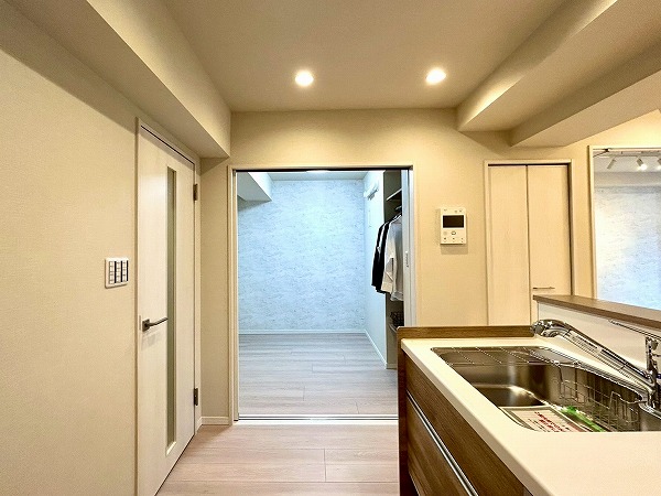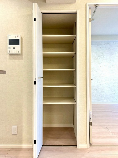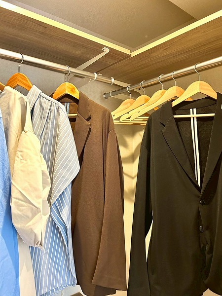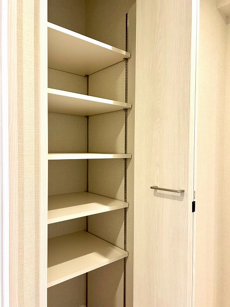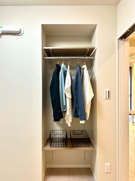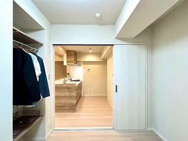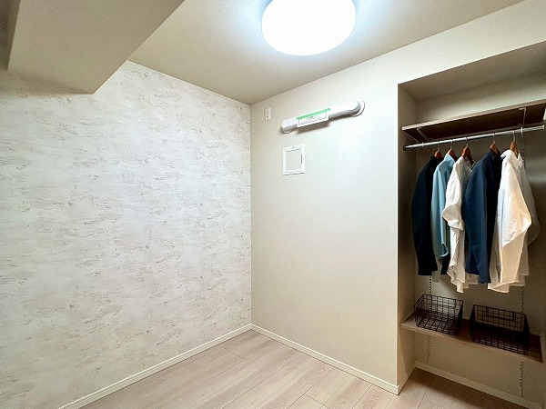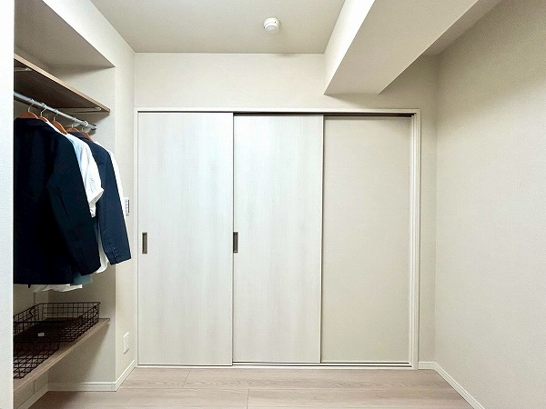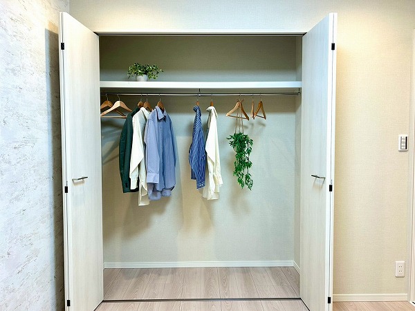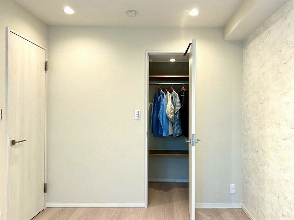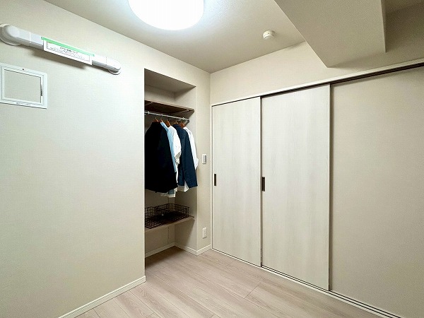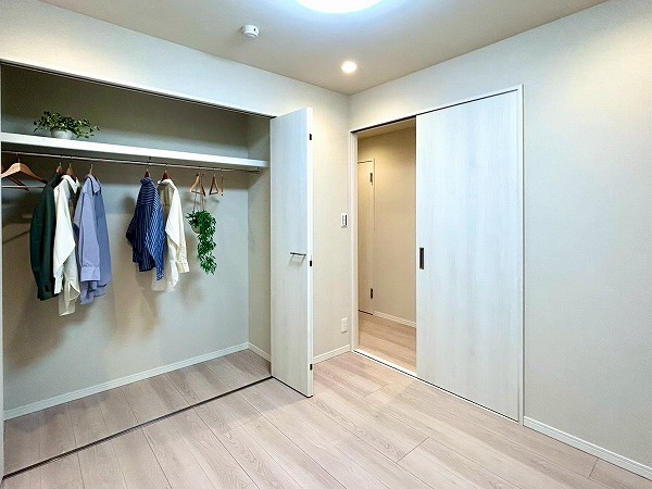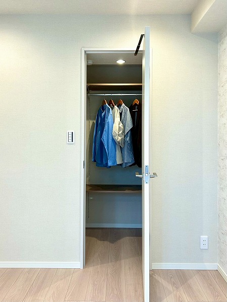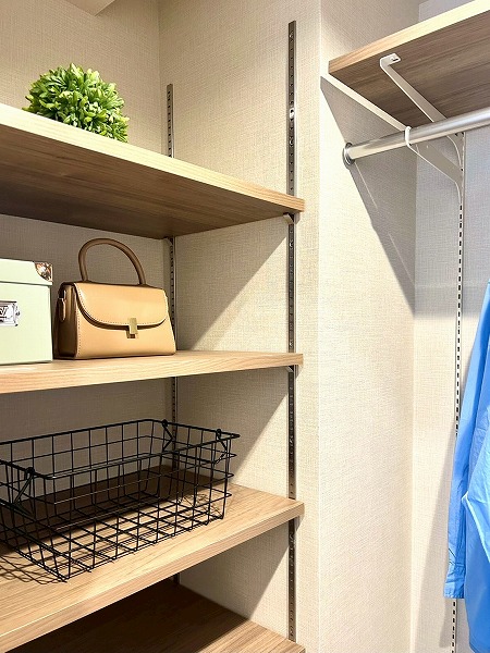 約5.9帖の洋室にはマルチウォークインクローゼットがあり、衣類に限らず様々な物の収納が可能となっております。可動棚が備わっており、こちらには日用品から趣味のものまで、スペースを有効活用して置くことができそうですね。