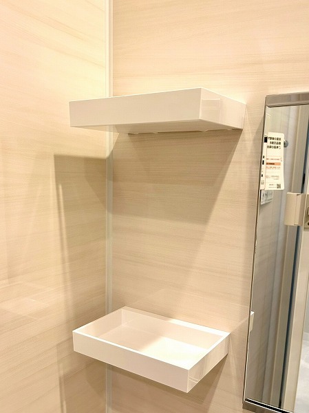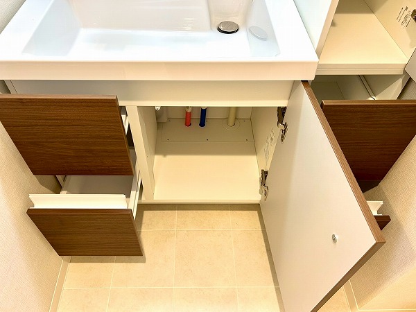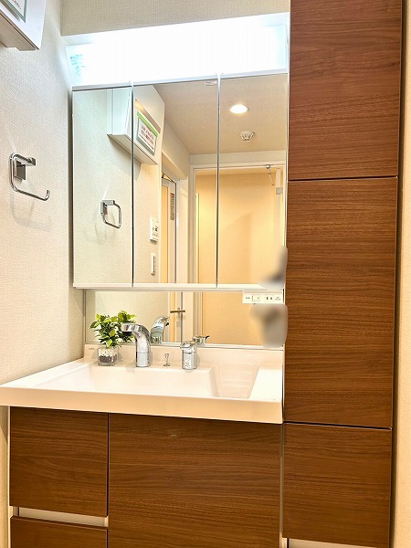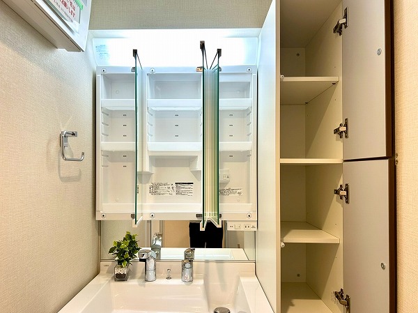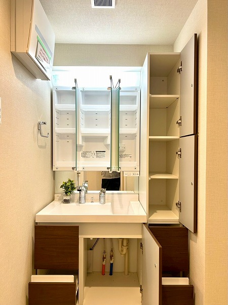 化粧洗面台、洗濯機置き場、バスルームが集結したパウダールームは日々の生活に寄り添った、使いやすい設計となっております。化粧洗面台は収納が多く備わっており、日用品等を十分に収納することができそうです。