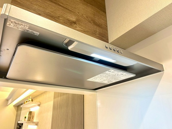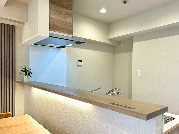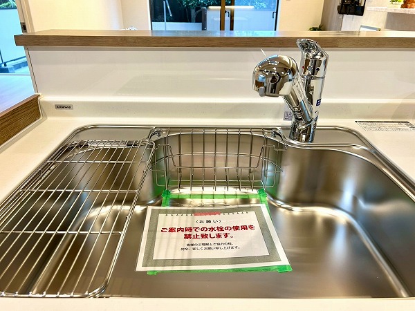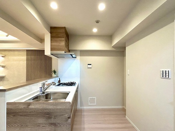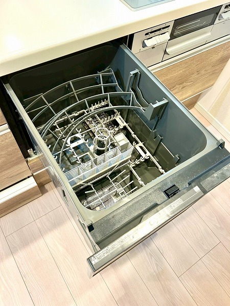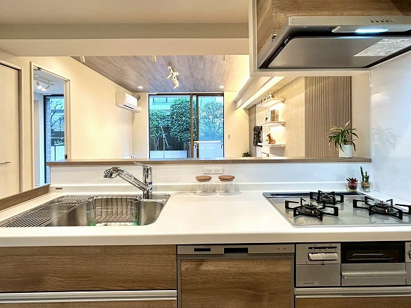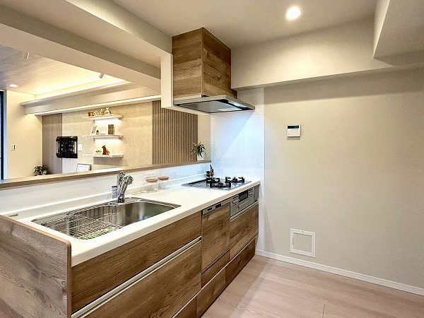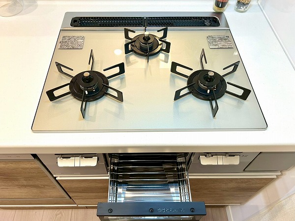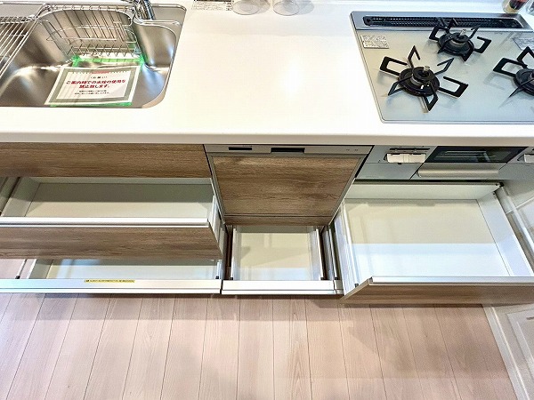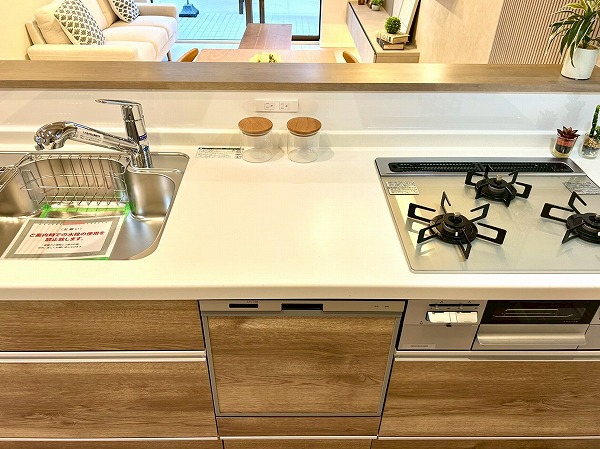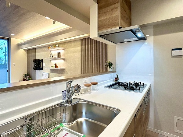 キッチンは対面式となっており、家族や友人と会話を楽しみながら料理ができそうですね♪3口コンロ、食洗機付きで日々の家事をスムーズに行えます。背面のスペースが広く、使いやすいようにキッチンシェルフ等を並べたら、より家事効率が上がりそうですね!