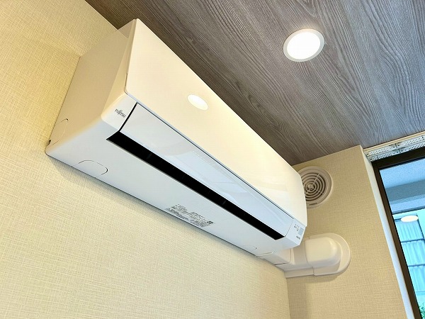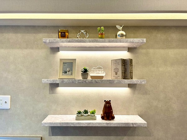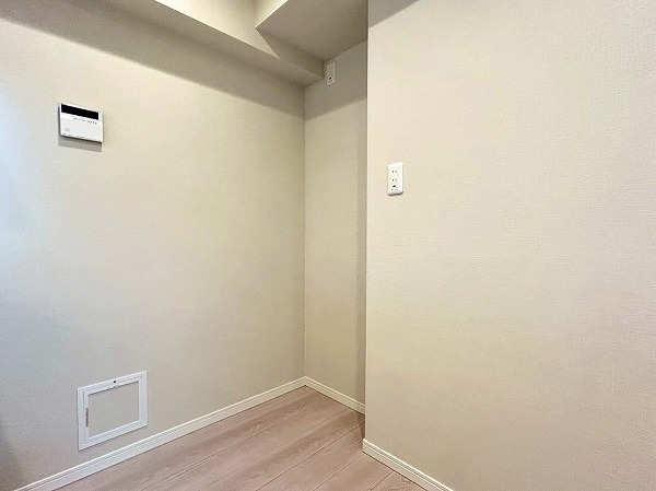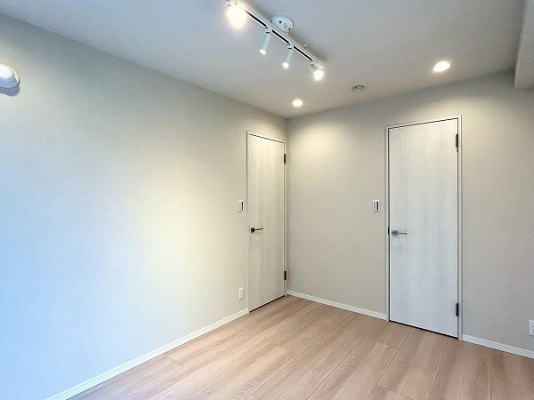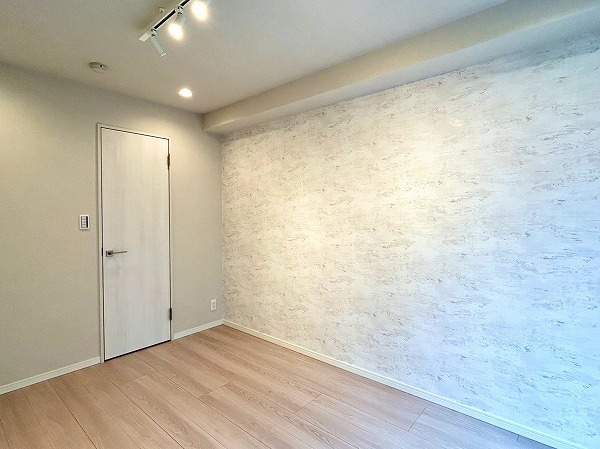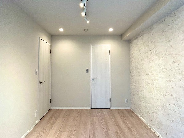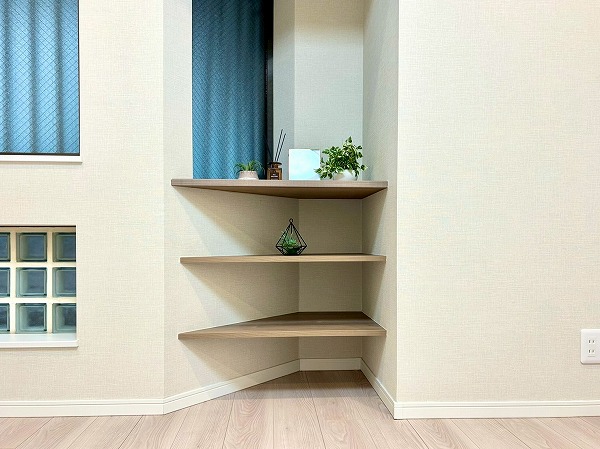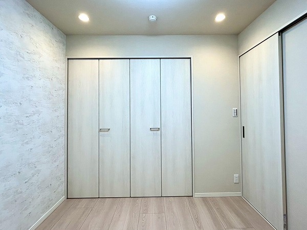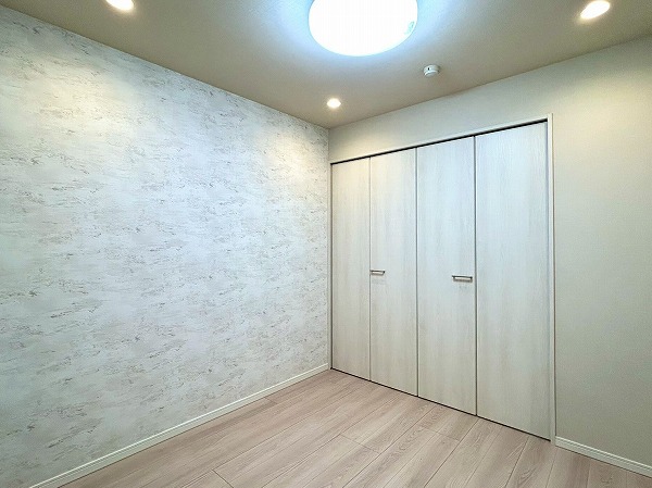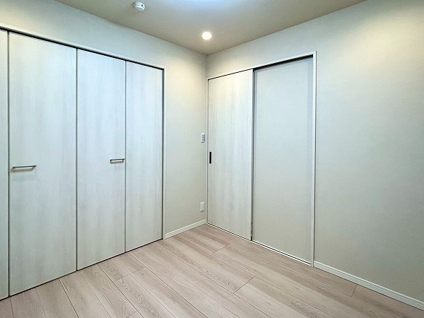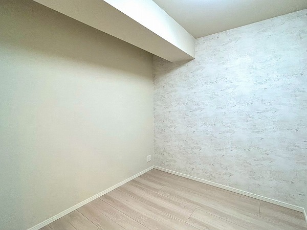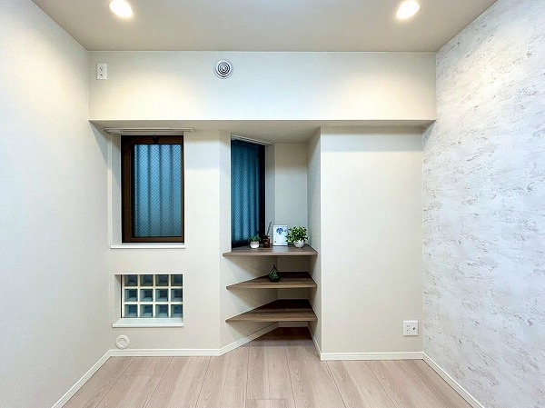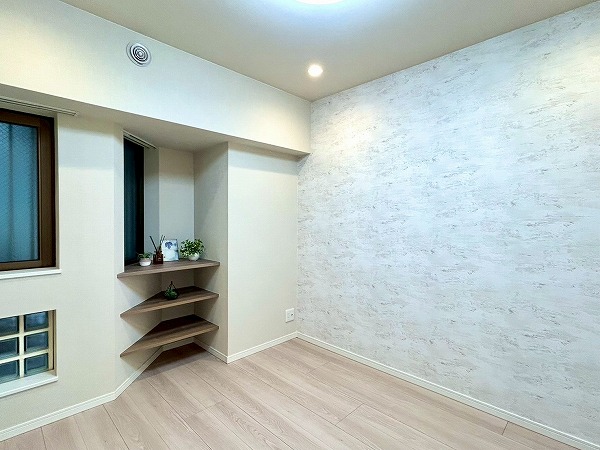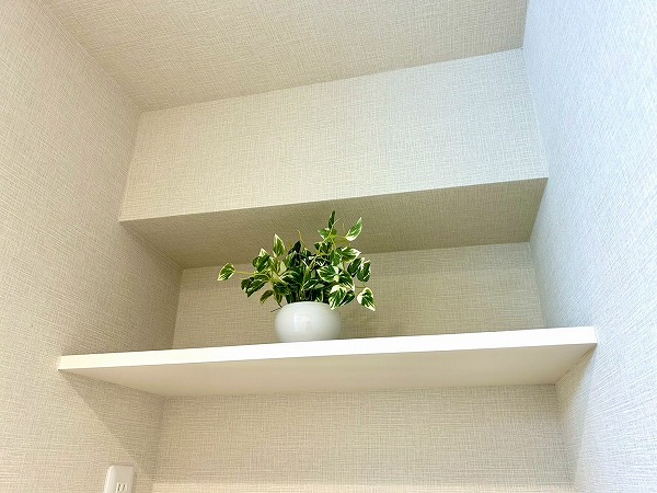 約5.4帖の洋室には壁の凹み部分にコーナー棚があります。インテリア小物や本などをお洒落に置くことができ、空間にワンポイント加えてくれています。高さのあるクローゼットも設置されており、衣類を収納すればお部屋を広々と使えますよ。