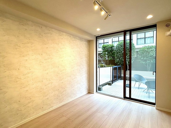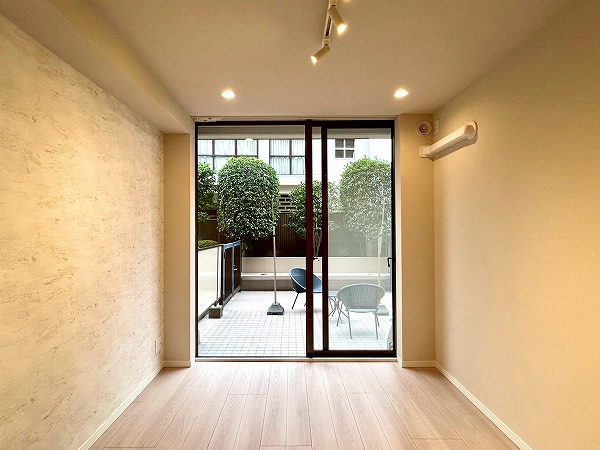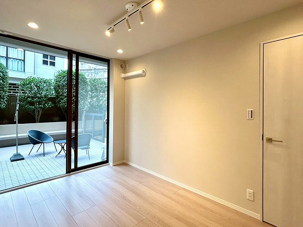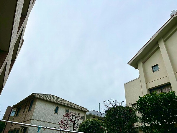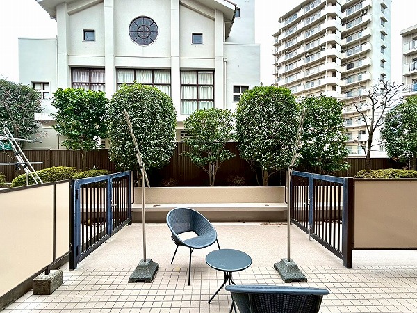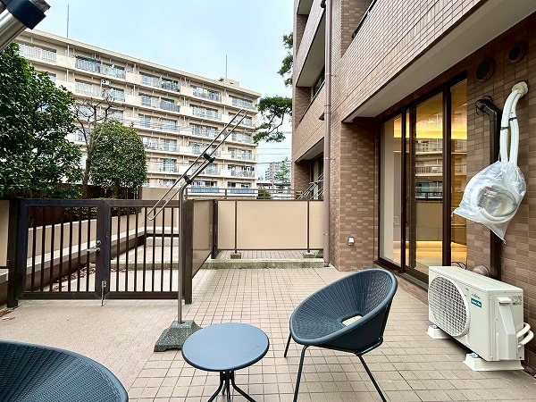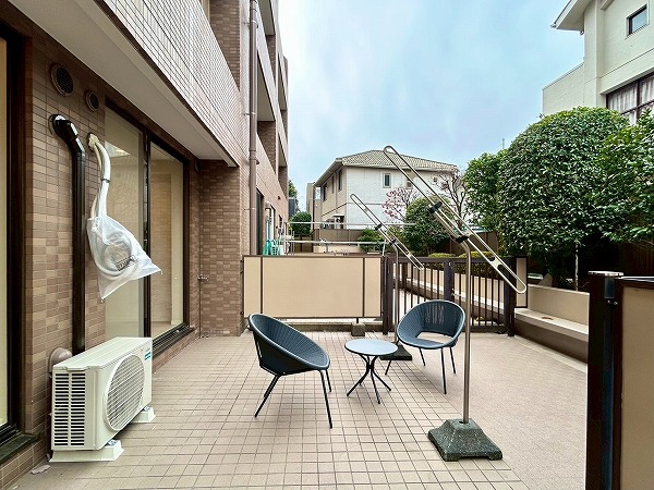 26.99㎡の広々とした専用庭✧テーブルと椅子が置いてあり、のんびりと過ごす情景が浮かんできますね。1階ですが、建物自体が少し高い位置に立っているので空が広く見えます。十分に日が当たるので、洗濯物も良く乾きそう✧