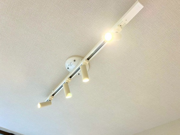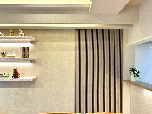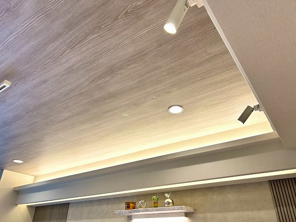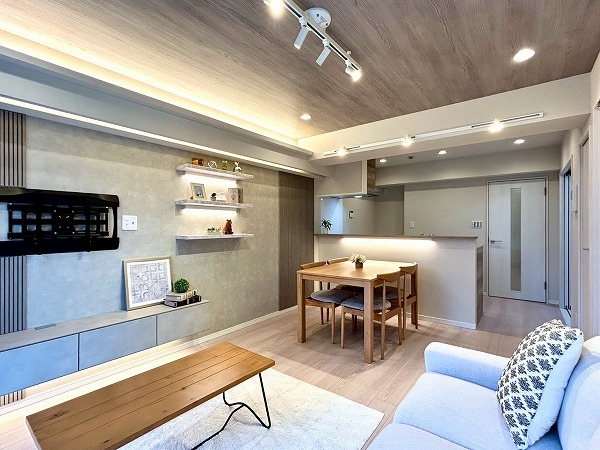 約12.5帖のLDKは広々した印象があり、主要家具を置いても空間にゆとりがありますね。フローリング、クロス、天井すべて異なったデザインとなっており、こだわりを感じます。別々のデザインでありながらも統一感があり、落ち着いた印象です♪