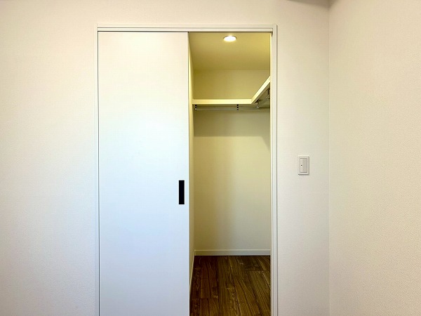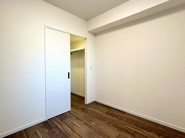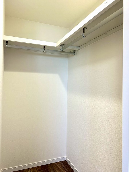 約4.9帖の洋室にはウォークインクローゼットがあります。フックの上部分にも収納棚が設置してあり、オフシーズン物の衣類もスッキリ収納できそう。木目調のフローリングは落ち着いた雰囲気で、寝室として使用すればリラックスできそうですね。