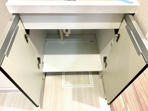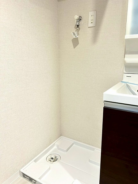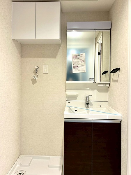 独立洗面台、トイレ、バスルーム、洗濯機置き場が集結したサニタリールームは、生活動線がスムーズで家事も楽々。洗濯機置き場上には収納棚が設置されており、洗剤なども空間の雰囲気を保ちながら収納できそう。