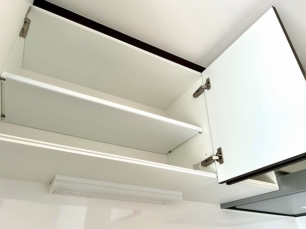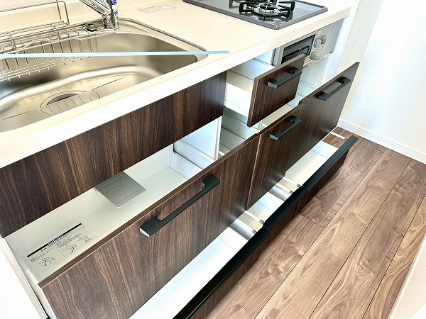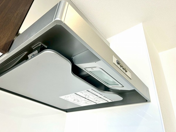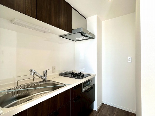 壁付けキッチンは料理に集中できる造り。上下に豊富な収納も備わっており、お皿や調理器具を収納できますよ。2口コンロ、グリル付きで忙しい朝も同時調理でスムーズに♪