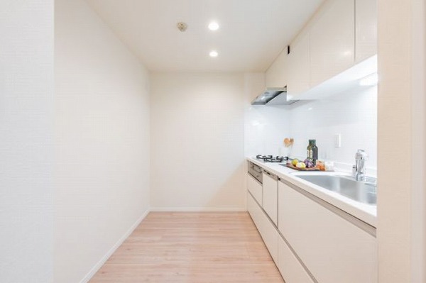 調理に集中できる、独立型のシステムキッチン。清潔感を感じられる白で統一されています。複数品の同時調理が可能なグリル付き3口コンロ&便利な食洗機が備わっていて、機能面も充実。