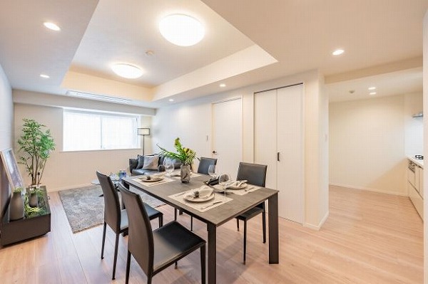 メインとなるリビングダイニングキッチンは、約14.4帖のリビングダイニングキッチン。奥行きがあるので、大きめのソファやダイニングテーブルなどの家具もゆとりを持って置けます。