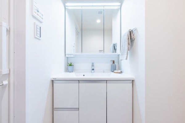 サニタリールームには、洗面化粧台とバスルームがまとまっています。人気の3面鏡が採用された洗面台は使い勝手が良く、収納部分も充実。