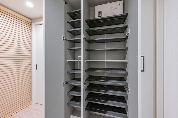 スタイリッシュな雰囲気の玄関には、トールタイプで大容量のシューズボックスが備わっています。ご家族全員分の靴を綺麗に保管できそう。