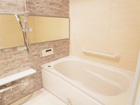 バスルームは石調のパネルでこちらもこだわり満載★追い焚き機能や浴室乾燥機を完備し、機能面でも大満足できますね(*^^)v