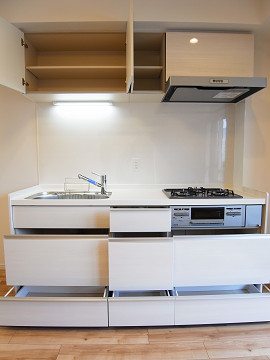 日本橋小網町ハイツ キッチン見た目はスマートですが隠れた収納力が頼りになりますd(*^v^*)bたくさんのスライドストッカーは嵩張る調理道具もきちんとしまえそう♪