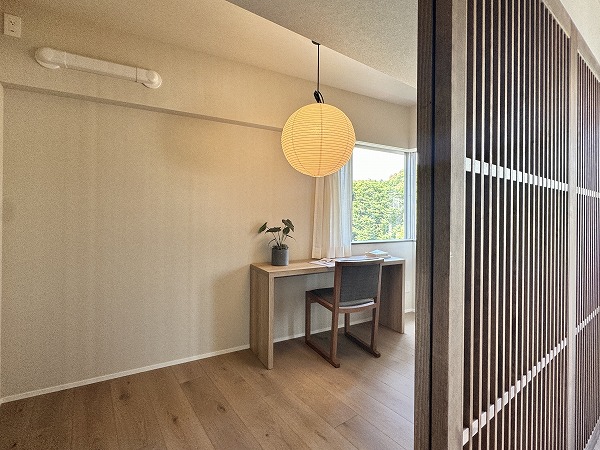 静かに過ごしたい時はメインルーム奥の洋室へ。木製の格子が柔らかく目線を遮り、読書や作業にぴったりの穏やかなこもり感をお楽しみいただけますよ♩
