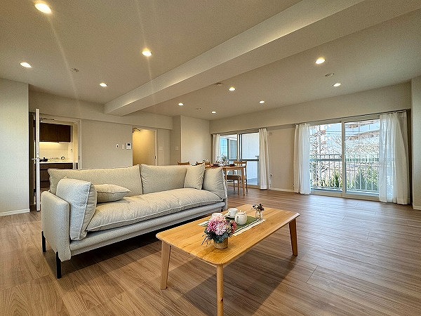 淡く柔らかな色合いと上質な素材が調和したリノベーション物件!3方向角住戸だからこそ味わえる光と視線の抜け感が魅力的な一室です。