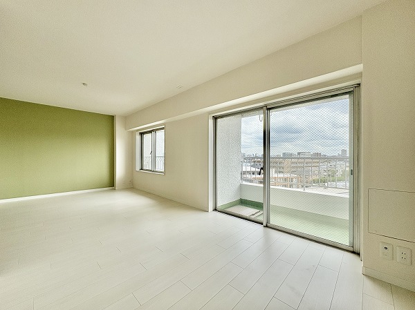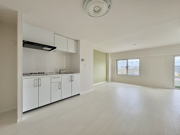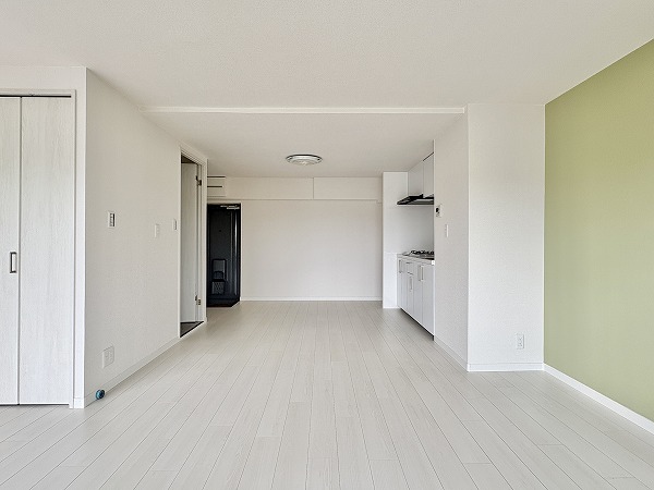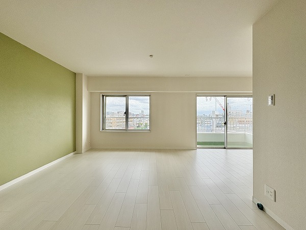 メインとなるリビングダイニングキッチンは、約14.8帖の広さがあり開放感に溢れています。一部採用された淡いグリーンのアクセントクロスが、とっても爽やかな印象♪