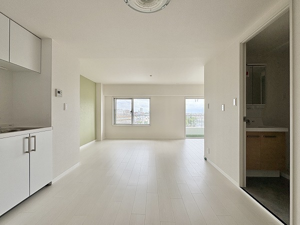 ゆったりと開放感のあるお部屋で1人暮らしをしたい方におすすめなお部屋です☀約20帖の大型ワンルームとしても利用可能な1LDK。撮影に伺った際は仕切りの扉がまだ設置されていませんでしたが、間取り図では玄関から見て右奥のクローゼットがあるスペースが洋室とされています。ワンルームの状態だとより明るく開放的な印象✧日中であれば照明を点けなくても問題なく過ごせますよ。居室と玄関や水回りの間に室内廊下を挟まないシンプルなレイアウトで、お風呂もシャワールームのみ。居室を最大限に広く確保したレイアウトとなっています。個人的にはワカバ色のクロスがとても可愛いと思いました♥窓の外の視界はスッキリと開けており、外からの視線は気にならなそう!ぜひ現地で直接ご覧になってみてください。 撮影・ライター:yuki【25I19】