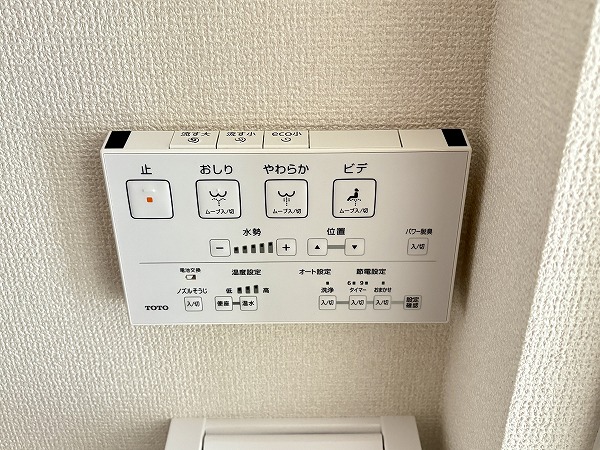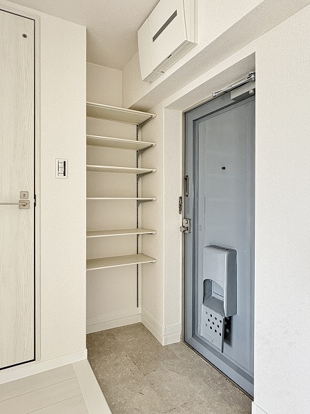 玄関にはオープンタイプの可動式棚が備わっていました。靴などを通気性良く保管できる便利なスペース。すぐお隣の扉を開けるとトイレになっています。お一人暮らしやDINKSにもオススメな間取り。