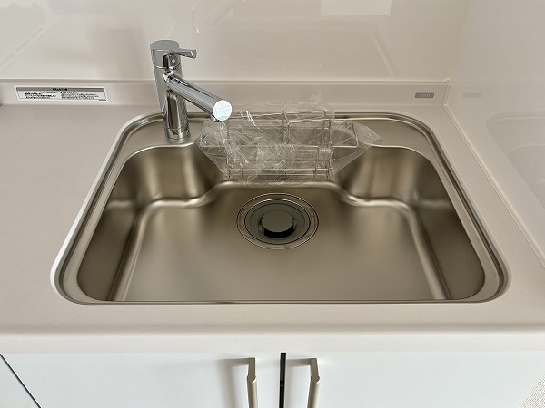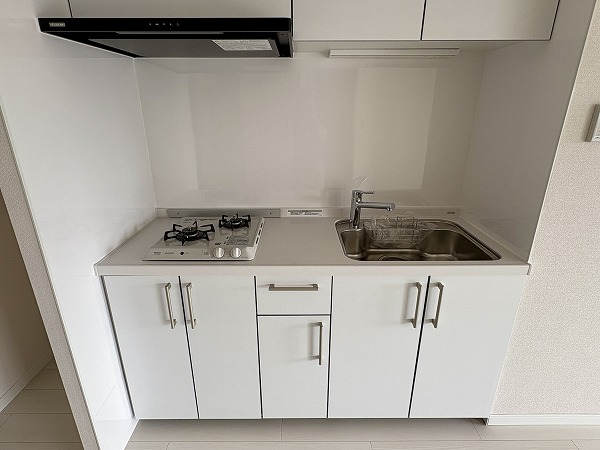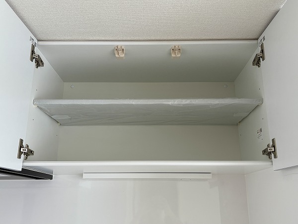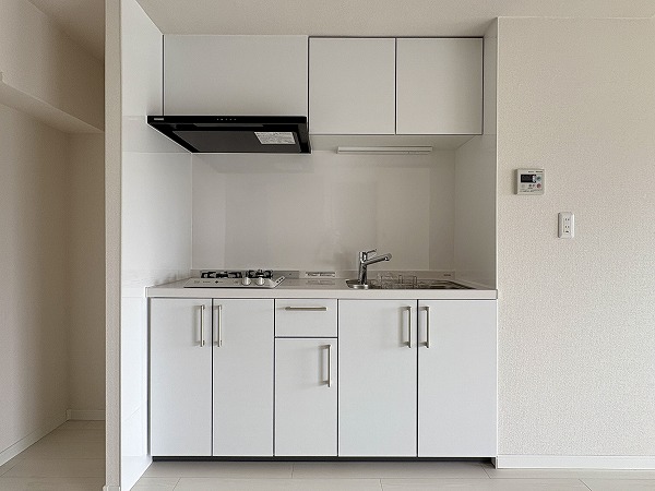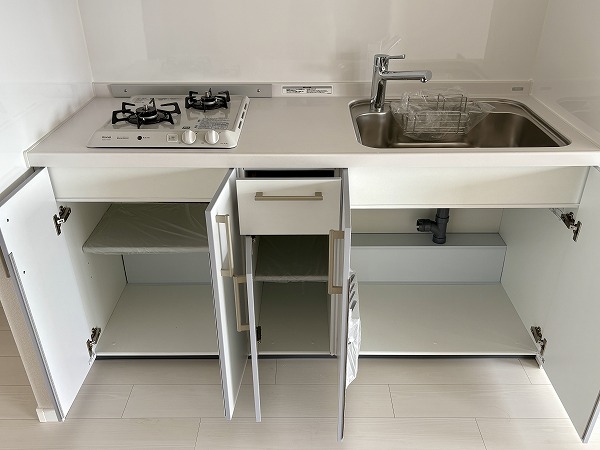 調理に集中できる、壁付けタイプのシステムキッチン。まさにシンプルイズベストなデザインで、お掃除も楽々です。収納部分も充実しているので、かさばりやすい調理器具もスッキリ整理可能。