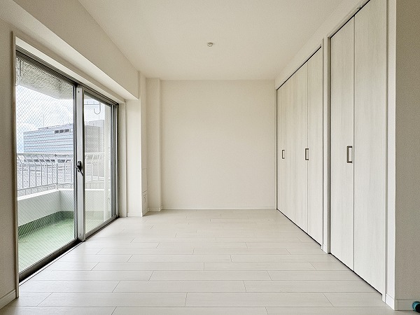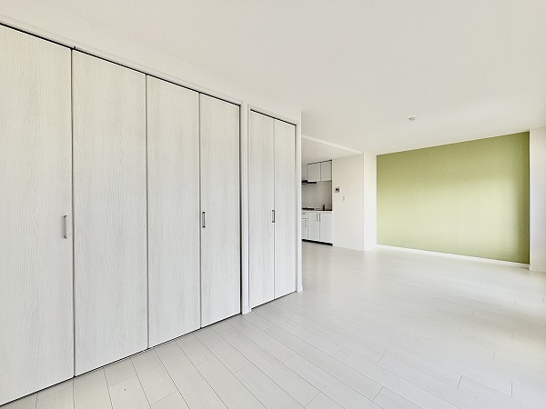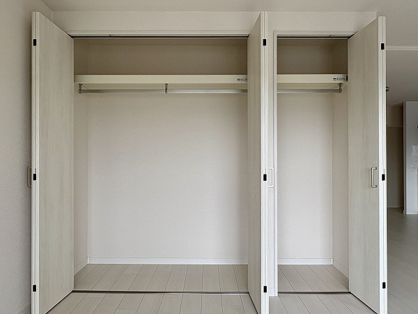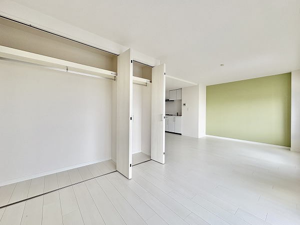 お隣には、おおよそ5.2帖の洋室が備わっていました。大容量サイズのクローゼットが備わっているので、季節もののコートやかさばりやすいダウンジャケットなども綺麗に保管できます。