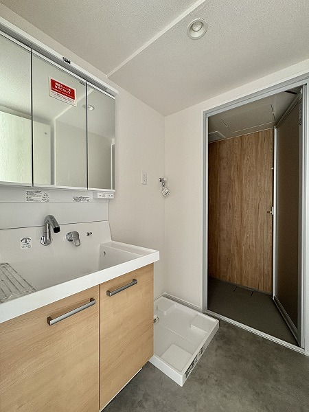 サニタリールームには洗面台・洗濯機置き場・シャワールームが集結しています。浴槽を設けず、コンパクトなシャワールーム仕様。限られた空間を効率的に活用し、掃除やお手入れも手軽に済ませられるのが大きな魅力です。忙しい朝の身支度や、仕事帰りにさっとリフレッシュしたいときに便利。